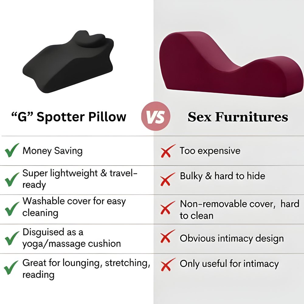 Unlike bulky furniture or overpriced gear, the “G” Spotter Pillow is simple, lightweight, and made to fit naturally into your space (and your routine). It’s comfortable, discreet, and easy to clean—built for couples who want better angles without the awkward setup. Perfect for play, lounging, or relaxation—one pillow that does it all.